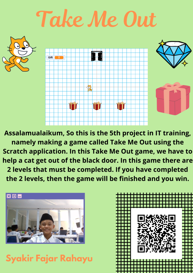 Assalamualaikum, So this is the 5th Project in the 7th grade IT lesson. We made a game together called take me out. We use a scratch app to create this take me out game. In this game, we are required to rescue a cat out of the door. But it’s not that easy, we have to go through some levels and obstacles in this game first. In this game there are 2 levels. The first level, we have to collect as many as 20 Diamonds. After the Diamonds have been collected up to 20, then the door can open and we can proceed to the next level. At level 2, we are required to answer some of the questions that are in the Gift.There are three gifts in the game which means we have to answer the 3 questions given in the gift. If you have successfully answered these 3 questions, then you will win this take me out game. Maybe that’s all from me, thank you, Wassalamualaikum …